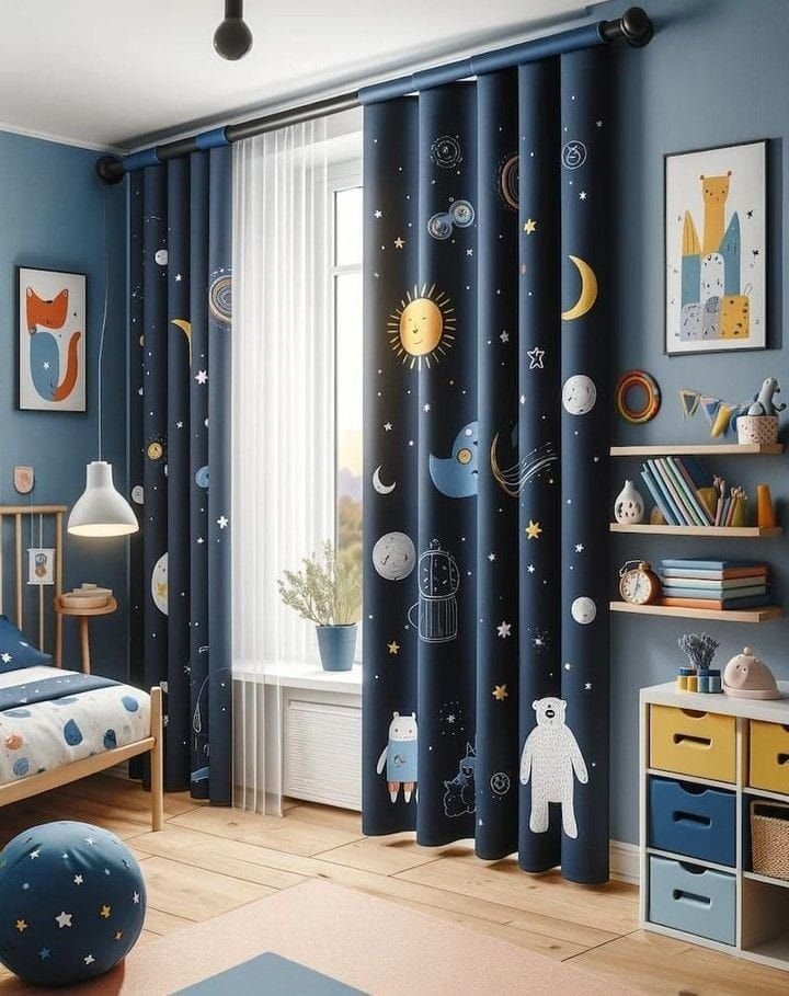 التنسيق بين لون الستائر وألوان الجدران والأثاث يمنح غرفة الطفل مظهرًا متناغمًا.
